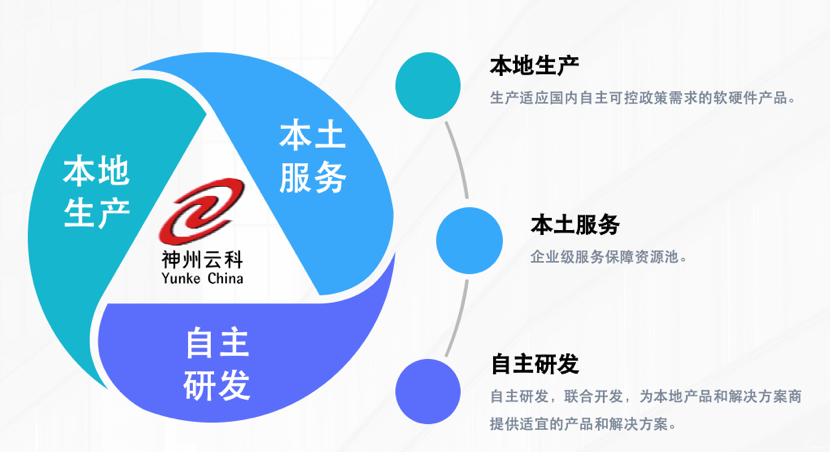 紧跟国家自主可控战略,云科通过“本地生产、本土服务、自主研发”的战略路径,打造自主品牌、生产自主产品,为合作伙伴提供神州数码自主品牌、自主知识产权的云基础设施产品、服务及解决方案。