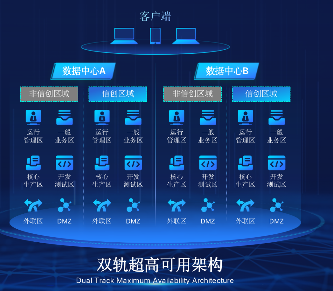 云科在企业面临自主创新IT基础重构过程中,推出的全新架构双轨超高可用架构(简称DTMAA),在双活数据中心的分区调度基础上,添加每个数据中心内信创域和非信创域的分域调度,来实现分区分域协同的多活双轨超高可用。