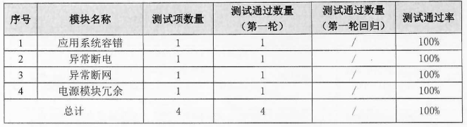 可靠性方面:测试范围包括应用系统容错、异常断电、异常断网、电源模块冗余共4个模块,执行四条用例,全部通过。