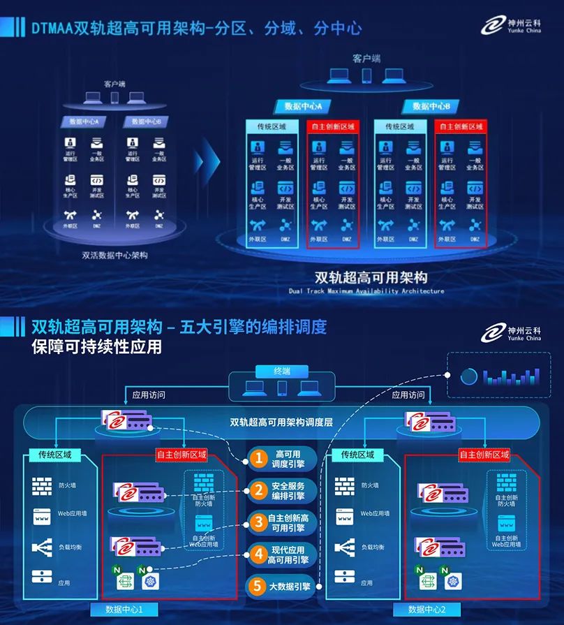 为助力银行业务高质量发展,更好地应对数字经济时代对可持续性的高要求,实现“信创”与“数字化”齐头并进,云科创新性的推出了双轨超高可用架构。该架构在双活数据中心的分区调度基础上,增加信创域和非信创域的分域调度,实行信创域与传统域应用全量部署,使双中心运营变为双中心四区域并行运行,互为多活,将“0到1”的单轨建设道路变为分区分域协同的多活双轨超高可用架构。帮助客户在新架构下,保障“信创”的同时解决性能瓶颈,提升稳定性,保证应用可持续性,最终实现信创区域和非信创区域的平滑过渡,完成国产化替代目标。