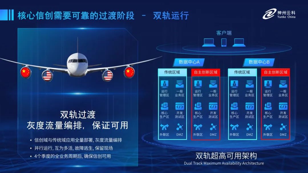 为帮助客户更好地应对数字经济时代对应用可持续性的高要求,实现信创与数字化兼得,云科推出了双轨超高可用架构。双轨超高可用架构在双活数据中心的分区调度基础上,增加信创域和非信创域的分域调度,实行信创域与传统域应用全量部署,使双中心运营变为双中心四区域并行运行,互为多活,将传统架构变为分区分域协同的多活双轨超高可用架构。帮助客户在新架构下,保障“信创”的同时解决性能瓶颈,提升稳定性,保证应用可持续性,最终实现信创区域和非信创区域的平滑过渡,完成国产化替代目标。”