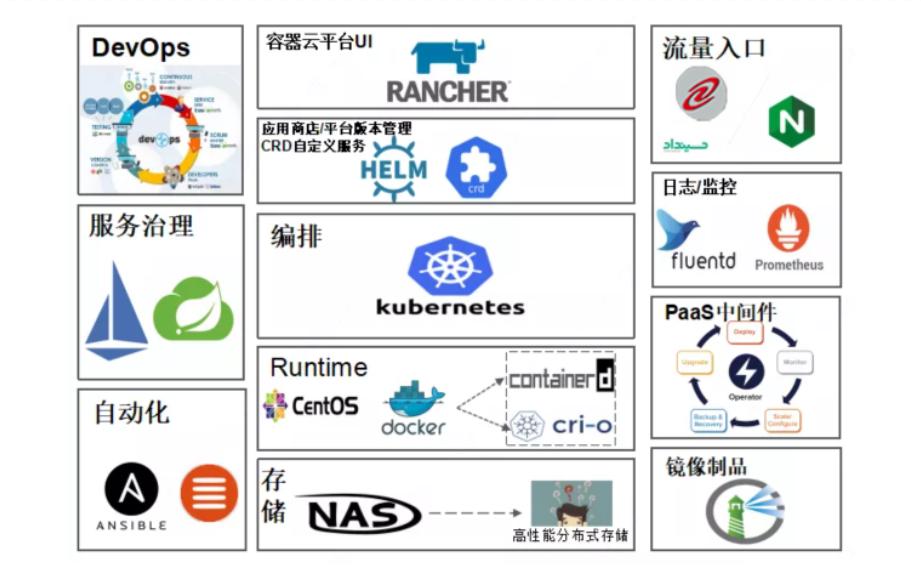 ►分层架构:以Kubernetes为核心组件的PaaS平台,整合EFK,Prometheus,Harbor等附加组件,PaaS服务分为三个平面,分别为管理平面、控制平面、计算平面。