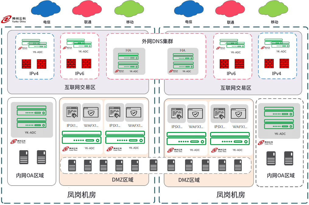 1、以云科应用交付体系为基础构建的新型交付型同城双活数据中心架构,保证数据中心高可用、灵活、便捷扩展、双中心双活